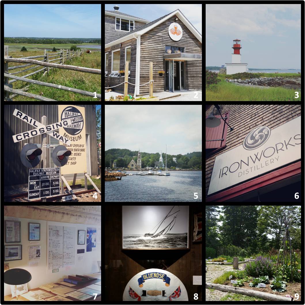 1: Historical Acadian Village of Nova Scotia in Lower West Pubnico, 2: Boxing Rock Brewing Co in Shelburne, 3: Geocaching at Pubnico Harbor Lighthouse in Lower East Pubnico, 4: Halifax and Southwestern Railway Museum in Lunenburg, 5: The Three Churches of Mahone Bay, 6: Ironworks Distillery in Lunenburg, 7: Shag Harbor UFO Incident Museum in Shag Harbor, 8: Fisheries Museum of the Atlantic in Lunenburg, 9: Acadian Museum and Archives in West Pubnico